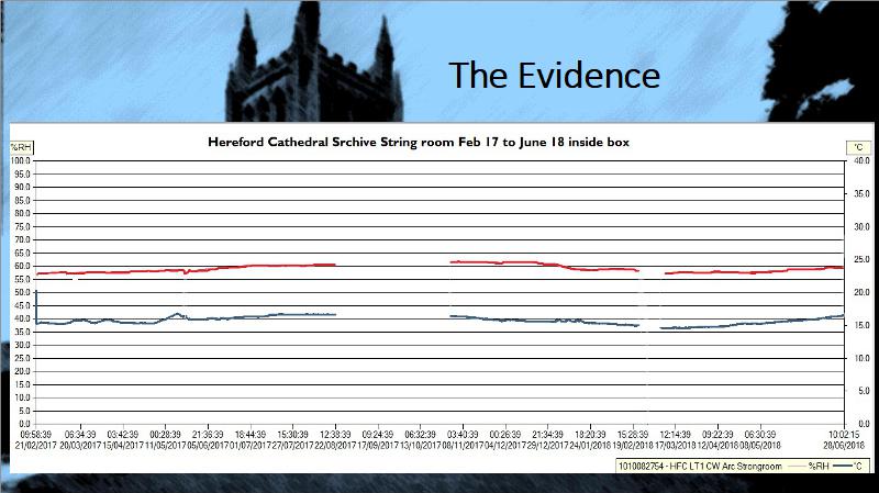 Mappa Chamber A public space with issues of temperature transference due to the nature of the map being under a laminated sheet of glass. The areas monitoring shows that although the RH moves a little during the day when visitors are in the space the ambient temperature affects the map in a quite dramatic way.